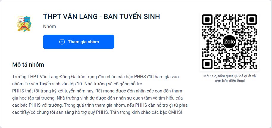 CMHS có thể quét mã QR Code Zalo để tham gia vào nhóm hỗ trợ của Nhà trường.